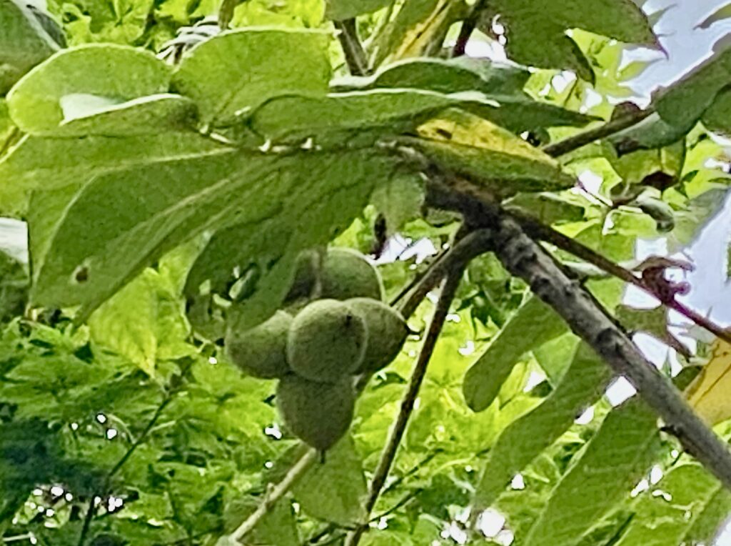 葉陰から覗くようにコロンとした緑色のまあるいものが寄りそったクルミの実がなっていました。