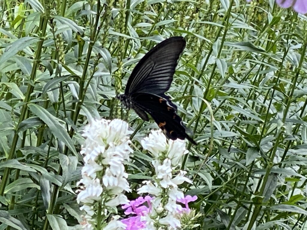 フロックス、サワギキョウ・・・花から花へ、過ぎゆく季節を惜しむかのようにクロアゲハが忙しげに飛び回っています。