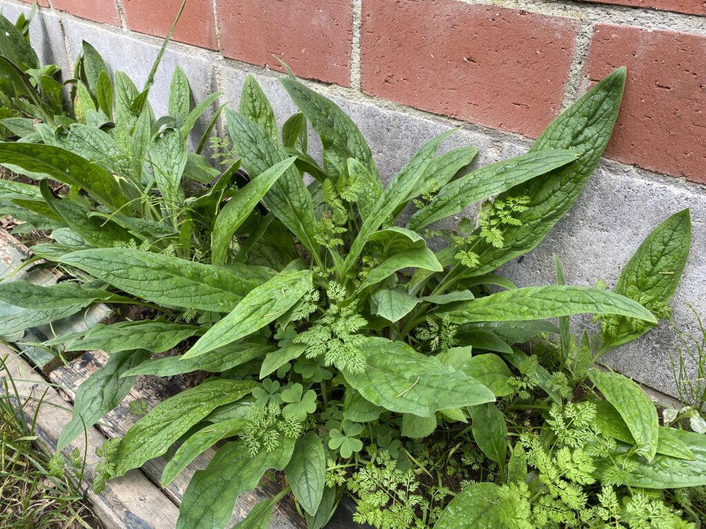 シノグロッサムの葉の間には、レースフラワーの葉もつられて伸びています。