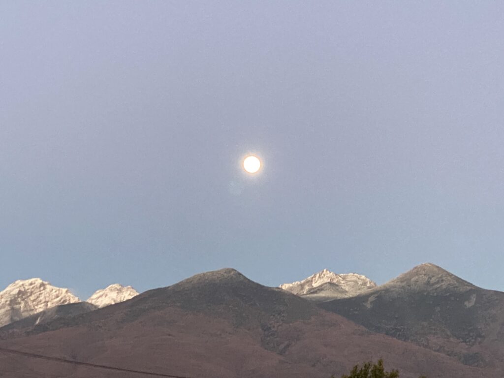 夕方、富士見町図書館からの帰り、雪を頂に乗せた八ヶ岳を見ると、大きな月が・・・。
