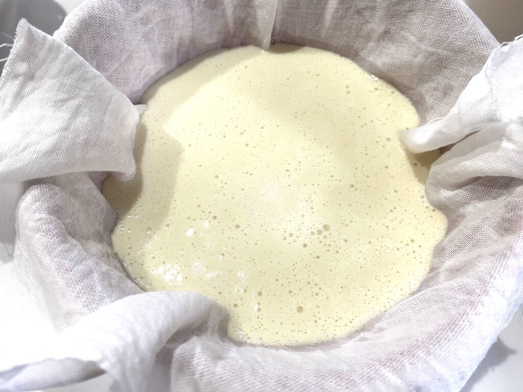出来上がった豆乳をサラシの布で濾すのですが、豆乳がきめ細かいので、なかなかサラシから落ちてくれないのです。
